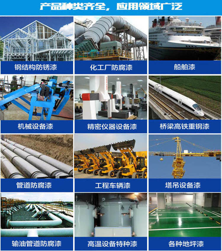 四、 施工及配套要求:该漆以刷涂为主,稀释剂为专用稀释剂。配套底漆为酯胶底漆、红丹防锈漆、灰防锈和铁红防锈漆。