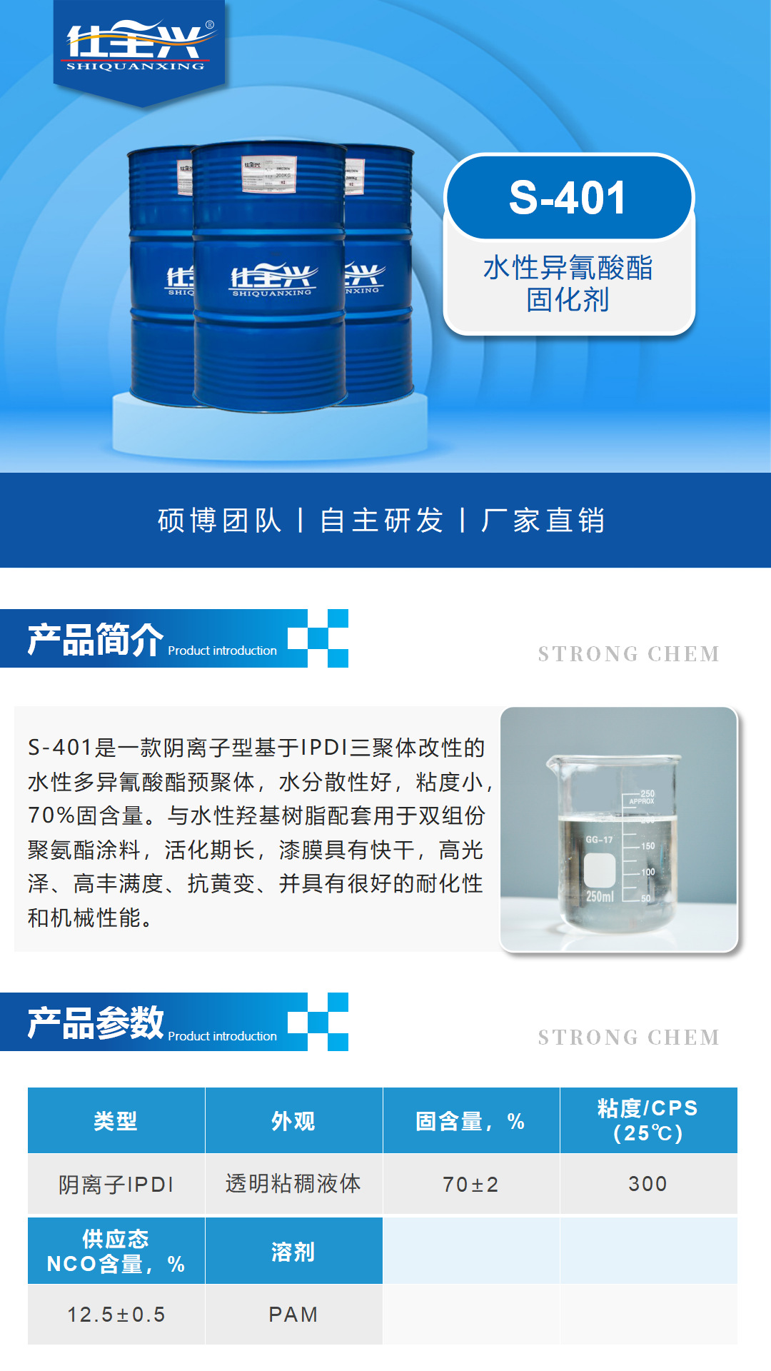 S-401是一款阴离子型基于IPDI三聚体改性的水性多异氰酸酯预聚体,水分散性好,粘度小,70%固含量。与水性羟基树脂配套用于双组份聚氨酯涂料,活化期长,漆膜具有快干,高光泽、高丰满度、抗黄变、并具有很好的耐化性和机械性能。