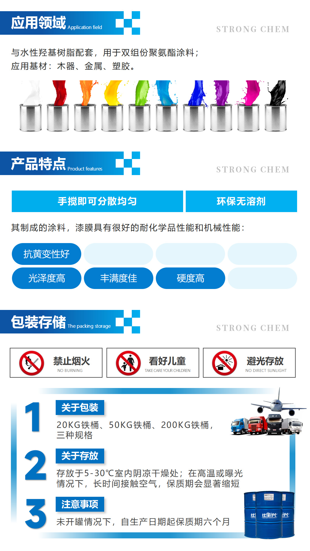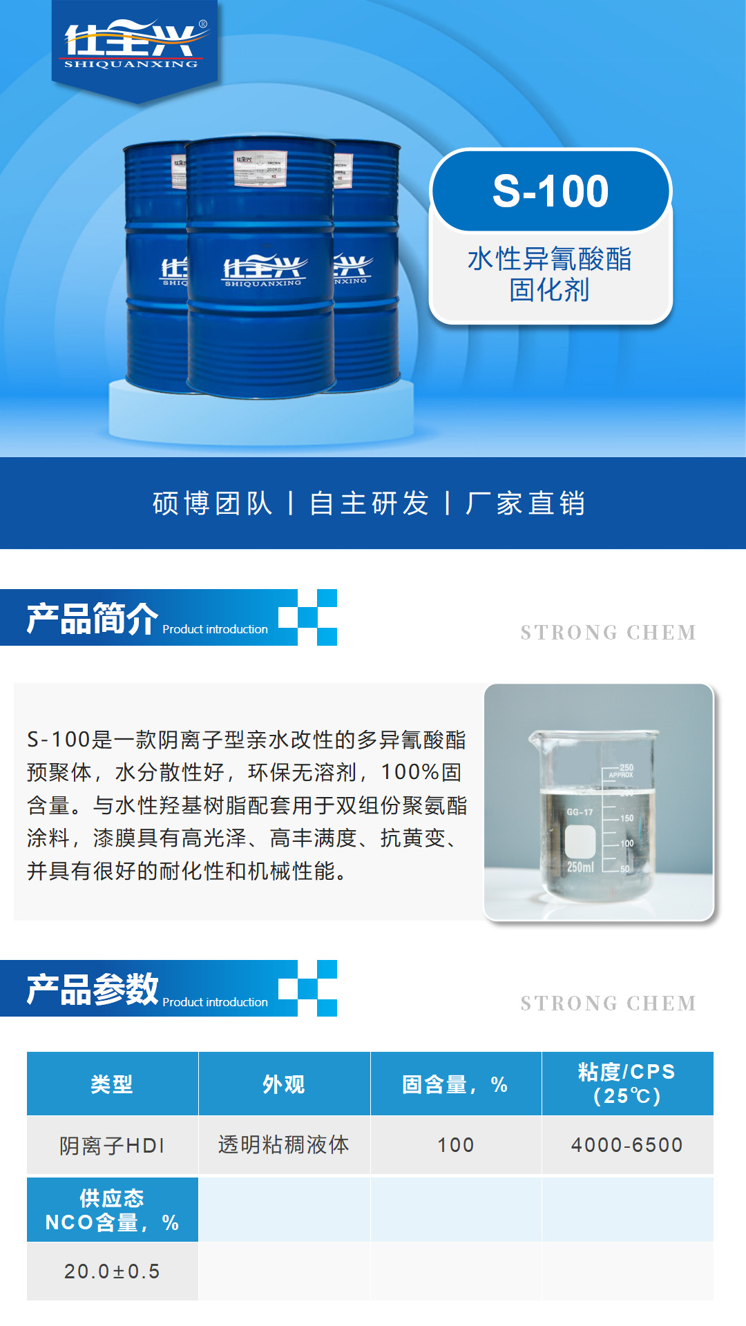 S-100是一款阴离子型亲水改性的多异氰酸酯预聚体,水分散性好,环保无溶剂,100%固含量。与水性羟基树脂配套用于双组份聚氨酯涂料,漆膜具有高光泽、高丰满度、抗黄变、并具有很好的耐化性和机械性能。
