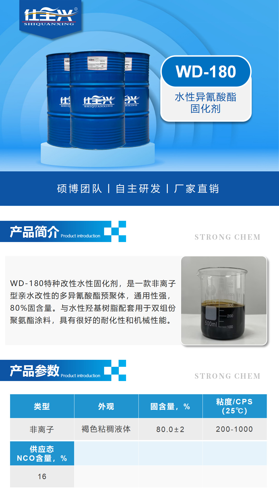 WD-180水性无溶剂固化剂是一款非离子型亲水改性的多异氰酸酯预聚体,通用性强,80%固含量。与水性羟基树脂配套用于双组份聚氨酯涂料,具有很好的耐化性和机械性能。