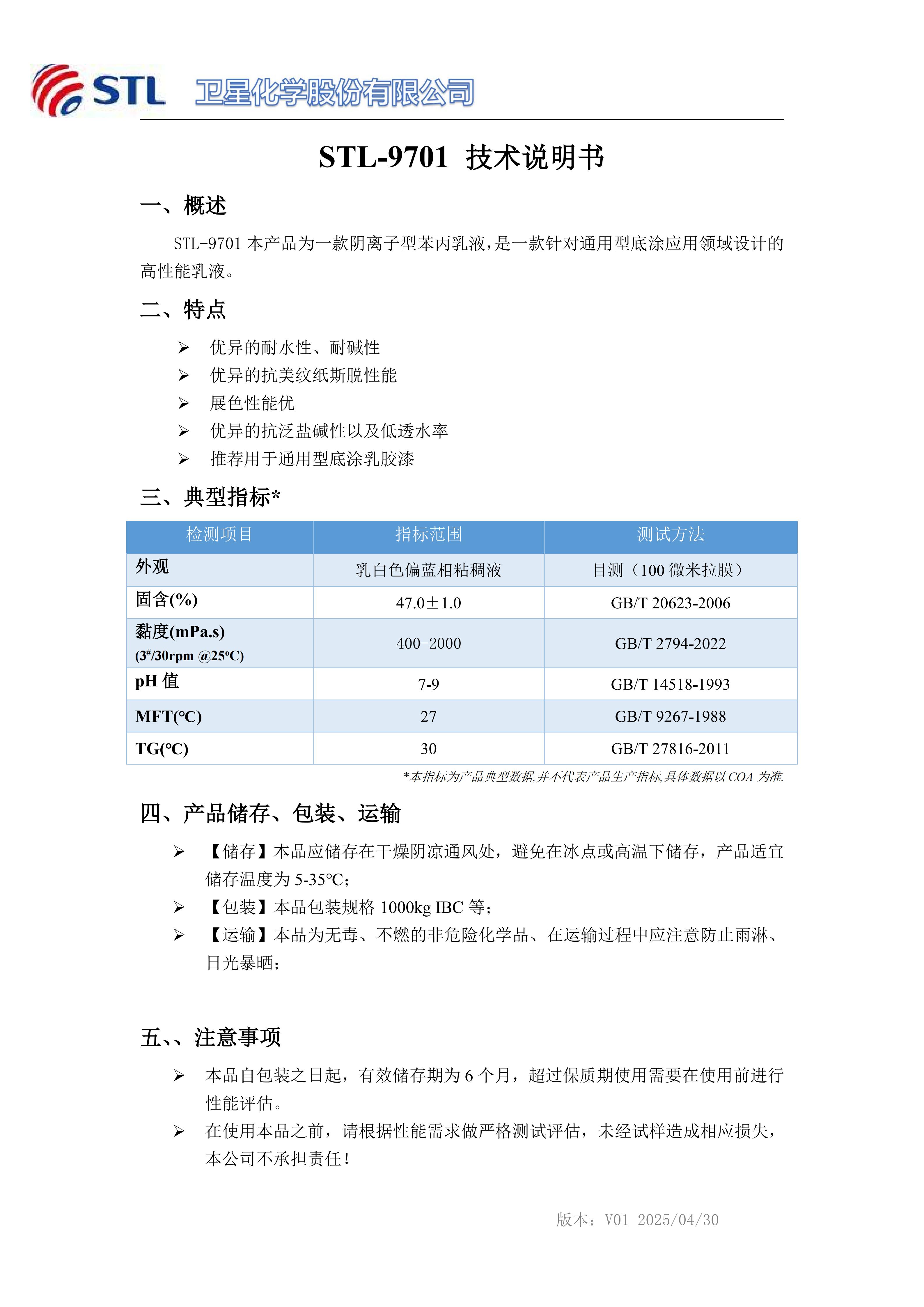 阴离子型苯丙乳液 STL-9701 浙江卫兴新材料科技有限公司