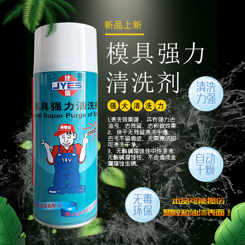 根据模具制造、使用、封放和材质等的实际情况,针对模具表面的油渍污垢和炭积物,研制独有的特殊配方,具有强大的清洗力,能迅速清除模具表面的污积物,并有自动干燥功能,无损塑料和油漆表面。 使用方法:用抹布抹去模具表面污积物,以便加快清洗速度,减少模具表面的残留物;用本品距离需清洗部位20厘米左右,按下喷头垂直清洗。 包装规格:450ml喷剂、4L、20L和200L或接客户要求订做。