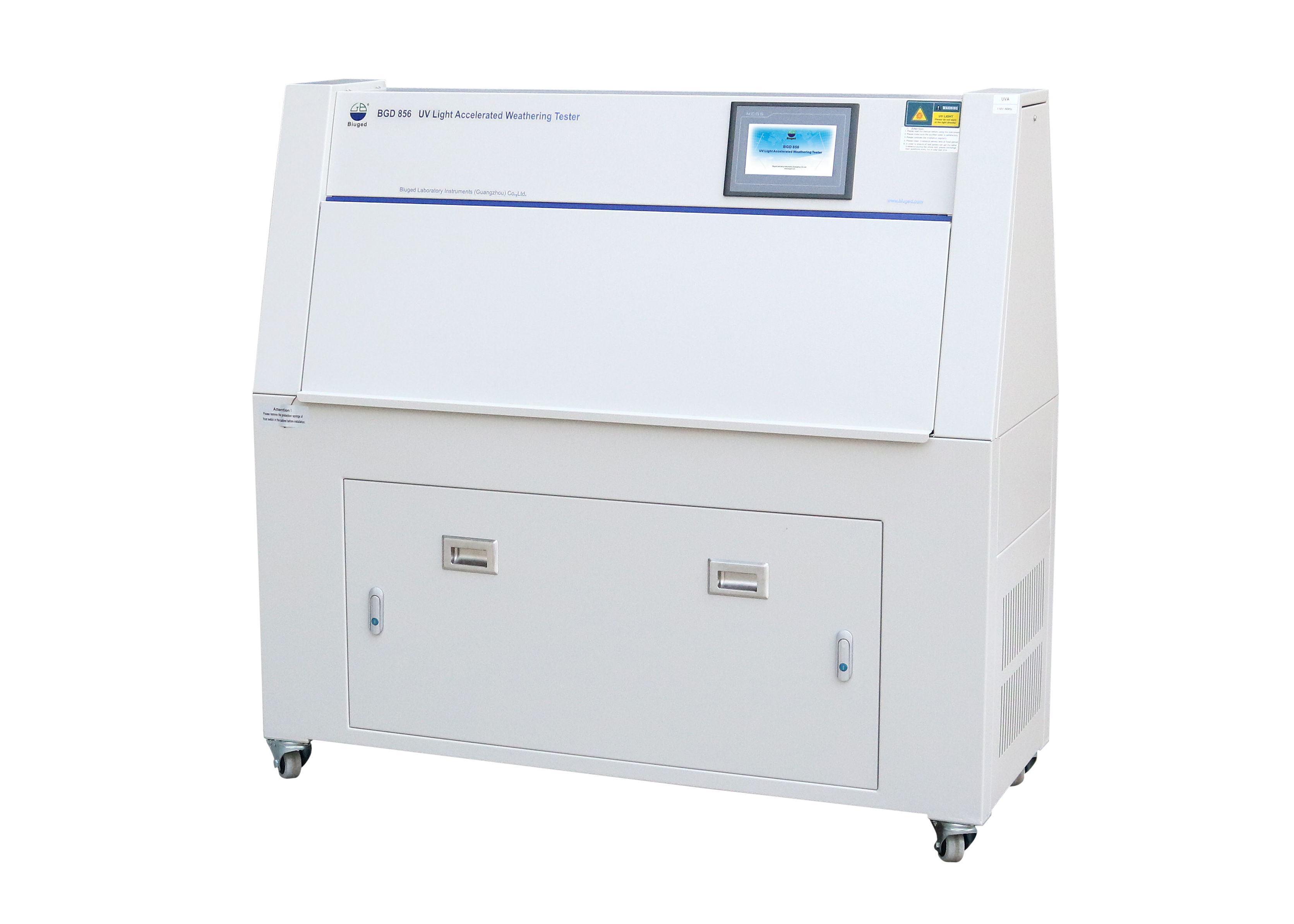 BGD 856荧光紫外加速老化试验箱(以下简称BUV)以荧光紫外线灯做光源,并适当控制温度、湿度使在样品上周期性的产生凝露,来全面获得阳光、潮湿及温度对高分子材料的破坏影响结果(材料老化包括褪色、失光、强度降低、开裂、剥落、粉化和氧化等)。 紫外灯的荧光紫外线等可以再现阳光的影响,冷凝和水喷淋系统可以再现雨水和露水的影响。整个的测试循环中,辐照能量和温度都是可控的。典型的测试循环通常是高温下的紫外光照射和相对湿度在100%的黑暗潮湿冷凝周期;典型应用在油漆涂料、汽车工业、塑胶制品、木制品、胶水等。 涂料行业中,国家标准或化工行业标准的船壳漆、船用水线漆、甲板漆、室内装饰装修用溶剂型聚氨酯木器涂料、室内装饰装修用水性木器涂料、紫外光(UV)固化木器涂料、家电用预涂卷材涂料、室内用水性木器涂料、卷材涂料、建筑用水性氟涂料等都明确规定采用荧光紫外老化来评估其耐候性能。