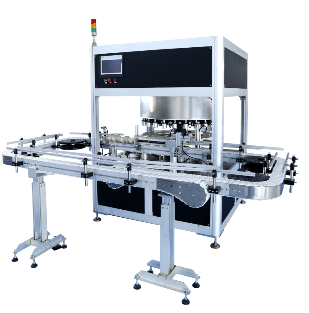 该设备用于高速的圆瓶和盖子检测测漏。有24个工位,接连不断,旋转输送的方式测漏。检测速度快,最快速度可达300-500/分钟。检测精度高,采用在线式压差法检测,精度可以达到0.05mm。可以单机使用,也可以连线并线使用。