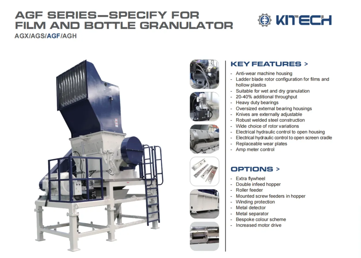 主要特点 1. 耐磨材料 2.用于薄膜和中空塑料的梯形叶片转子结构 3.干湿破碎 4.增加20-40%的产量 5.重型轴承 6.特大外轴承座 7.刀的外部可调 8.坚固的焊接钢结构 9.多种转子可选 10.液压控制外壳开启 11.电动液压控制开启筛架 12.可更换耐磨板 选项 1.额外飞轮 2.双横向进料斗 3.卷装喂料 4.上料螺杆上的料斗 5.绕组保护 6.金属探测 7.颜色定制 8.增大电机功率 简介 AGF薄膜&瓶子破碎机是专门为薄膜、瓶子等中空薄壁塑料的加工而设计的。它有一个中心铰接的两件切割室,采用坚固的焊接钢结构,外壳的上下部分水平相交。具有双切削刃的可逆定子刀作为单个元件安装在外壳的下部,允许定子刀的多次重新锐化和调整。有一个铰链屏蒂摇篮和铰链门,方便屏蒂访问。转子是一个重型桨型设计与刀盖板,以保护刀片时加工磨料的应用。与转子相反,刀安装螺栓被拧入安装板中。