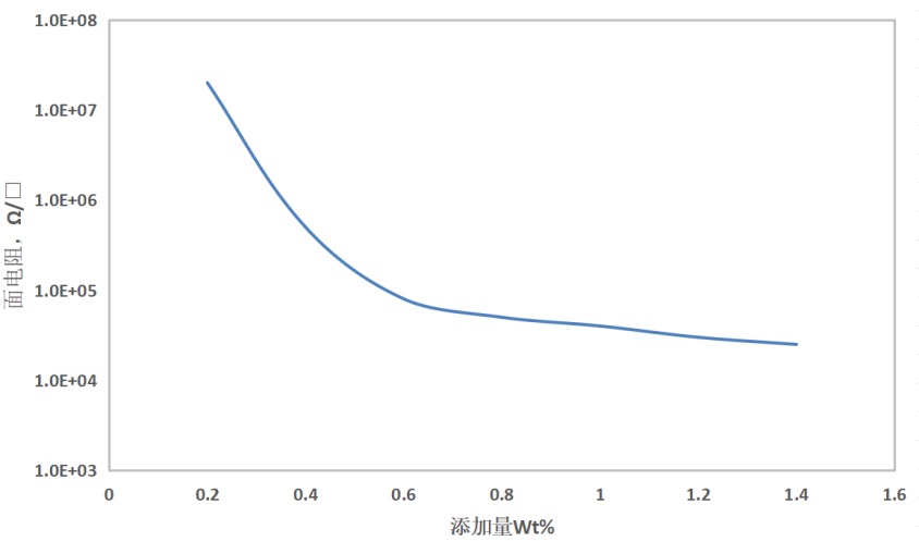 根据基体材料的特性及加工条件,KYSWCNT-TBC301在抗静电或导电消散应用中的建议添加范围0.1wt%-3.0wt%。具体添加量需综合考虑性能要求、基体材料、加工条件等。下图展示了将KYSWCNT-TBC301与DER351环氧树脂混合,并涂敷层薄膜的面电阻曲线。稀释过程采用机械顶置搅拌器完成,薄膜厚度为100um。