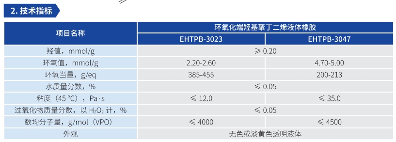 环氧化端羟基聚丁二烯液体橡胶是在端羟基聚丁二烯(HTPB)主链上引入环氧基团,可有效提高分子极性和反应官能团。分子中的环氧基可与多种类型的固化剂发生交联反应形成具有三维网状结构的高聚物,固化后的环氧化高聚物具有良好的物理化学性能,对金属和多种非金属材料具有优异的粘接性能,介电性能良好,收缩率小,硬度高,对碱及大部分溶剂稳定,可大幅提高聚氨酯材料的力学性能、黏接强度和耐热性。
