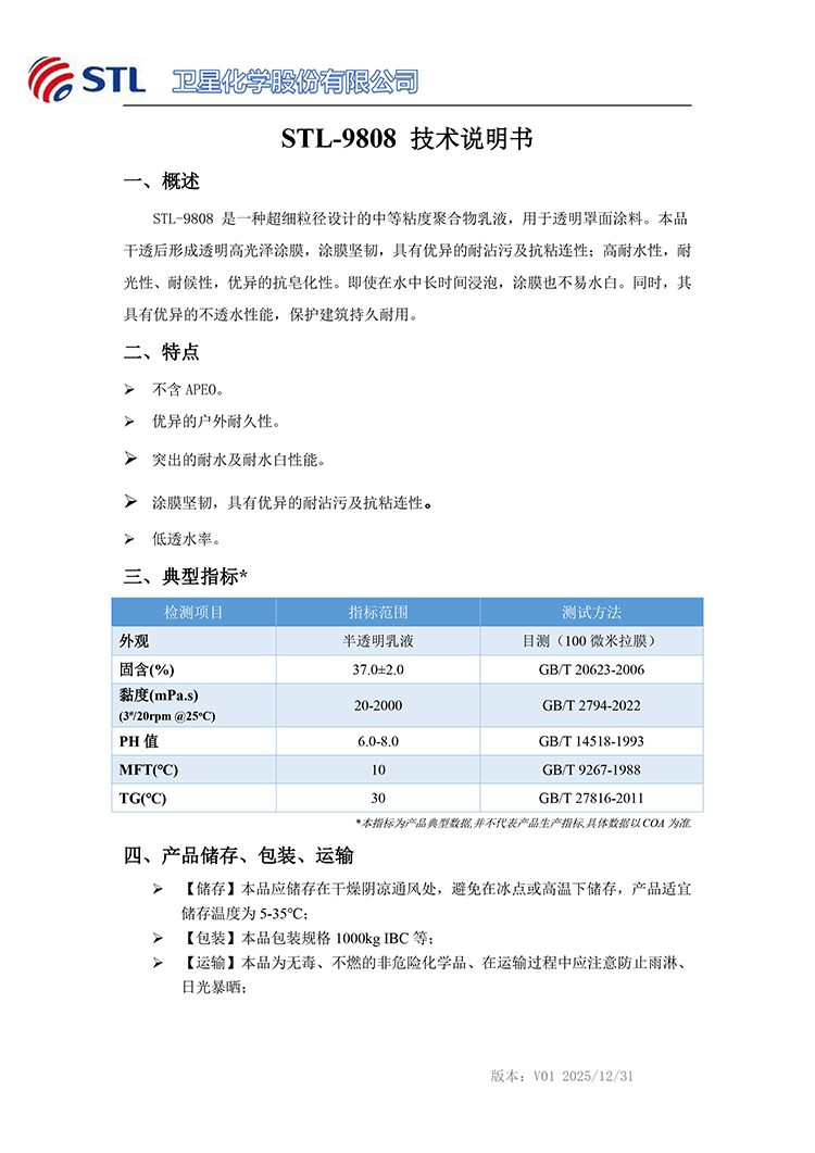 STL-9808是一种超细粒径设计的中等粘度聚合物乳液,用于透明罩面涂料。本品干透后形成透明高光泽涂膜,涂膜坚韧,具有优异的耐沾污及抗粘连性;高耐水性,耐光性、耐候性,优异的抗皂化性。即使在水中长时间浸泡,涂膜也不易水白。同时,其具有优异的不透水性能,保护建筑持久耐用。
