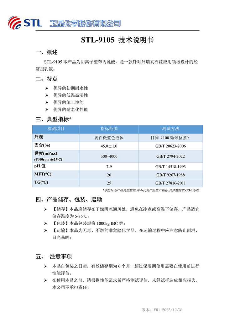 STL-9105本产品为阴离子型苯丙乳液,是一款针对外墙真石漆应用领域设计的经济型乳液。