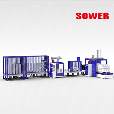 自动堆垛机将灌装好的涂料桶按组堆垛到托盘上。