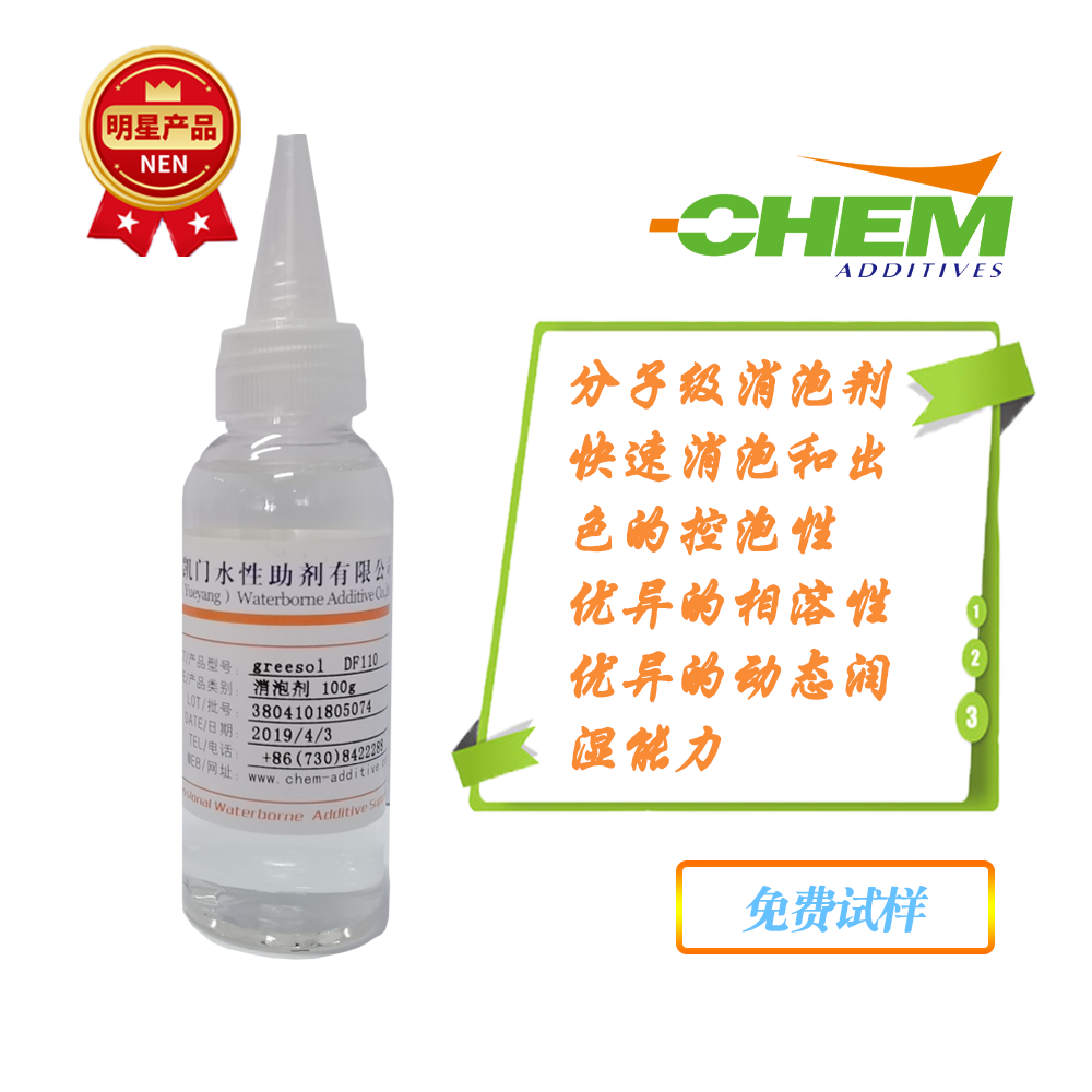 Greesol DF110 是一支基于双子星(Gemini)技术开发的不含有机硅,不含二氧化硅及矿物油的分子级消泡剂,其独特的分子结构使其具有泡沫控制和动态润湿作用。不影响重涂性、不影响光泽和透明性,具有持久抑泡性。对于硅硐类敏感的配方是很好的选择。