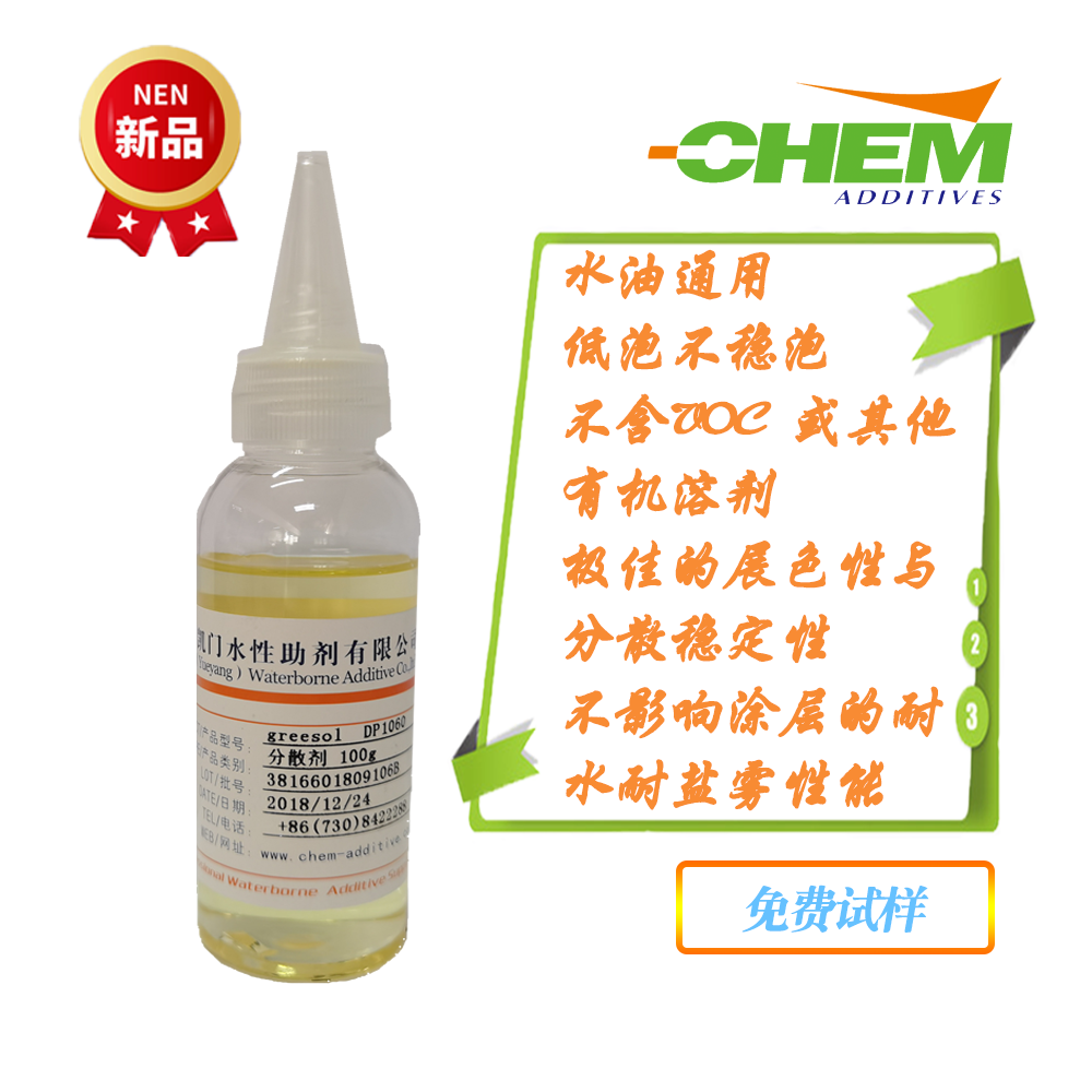 Greesol DP1060H 是基于可控聚合工艺的高分子润湿分散剂,低泡,能有效改善颜填料的分散质量,它主要是通过空间位阻稳定作用起到解絮凝,对不同颜填料都具有较优异的降粘性,特别适用于制备水性高固含有机颜料浓缩浆和碳黑分散,具有极佳的展色性与分散稳定性,是一支通用性较强的分散剂且不影响涂层的耐水耐盐雾性能。
