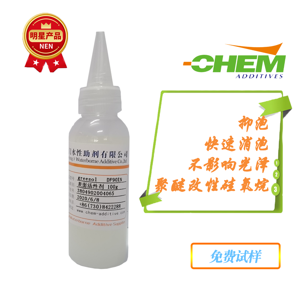 Greesol DF901N 是一支聚醚改性有机硅水基消泡剂,为半透明液体,独特的分子结构使其具有相溶性, 抑泡及快速消泡性三者之间的平衡。其消泡性与抑泡性优于 DF90,不影响光泽,透明度,具有持久快速消泡 性。不浮油,在较宽温度和 PH 值范围内稳定。
