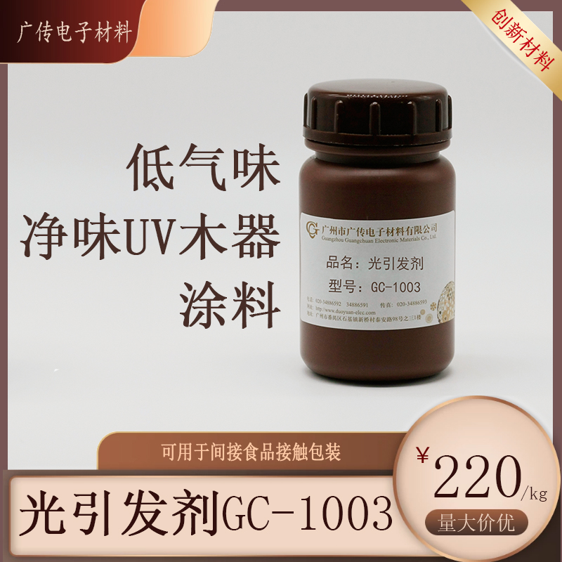概述 GC-1003是优秀的低气味光引发剂,独有的无气味特性,可用于间接食品接触包装,广泛用于各种食品包装UV油墨、净味木器涂料,低气味清漆等体系有较强的吸收性能。