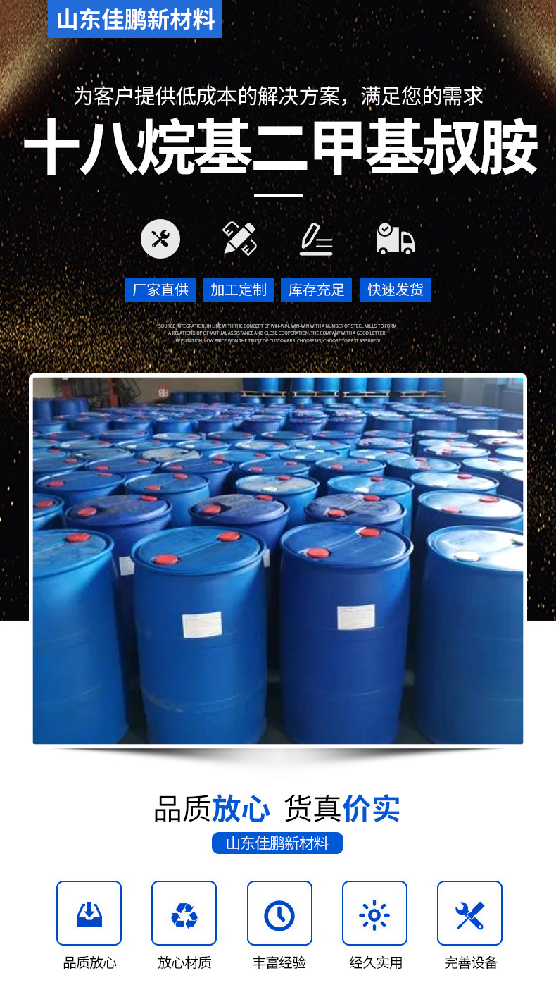 用 途 | 1.本品可以用于生产二甲基表面活性剂产品,其下游产品主要起杀菌作用。下游产品还可以在纺织行业作为匀染剂使用。 2. 本品可以生产三甲基系列表面活性剂,主要用于日化行业。 3. 本品可以用来制造两性表面活性剂甜菜碱,产品在油田采油等行业有重要应用。 4. 本品作为主要原材料所生产的表面活性剂氧化铵系列,下游产品发泡起泡效果显著,在日化行业内是较为重要的添加材料。 5. 本品还可用于织物柔软、抗静电剂、改善头发梳理性等产品。可用以生产驱虫剂。N,N-二甲基十八胺与环氧乙烷和硝酸反应,可制得十八烷基二甲基羟乙基季铵硝酸盐,即抗静电剂SN。 |