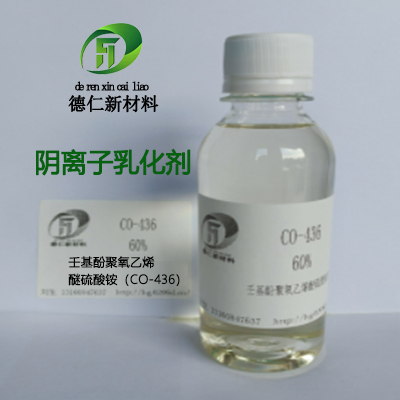 CO-436 是一种性能优异的多功能专用复合乳化剂,是乳液聚合的理想乳化剂,所做乳液粒径较小,具有卓越的润湿、分散、乳化性能,是良好的芳香族溶剂的乳化剂、中性或微硷性条件下的洗涤剂、织物处理用的润湿剂,成膜后的透明性,光亮性接近油性涂料。可制成高固低粘的乳液,由于此乳化剂是铵盐, 故迁移性能小,生产出来的胶乳,其粘合性,耐水性,耐擦洗等性能特别优越。