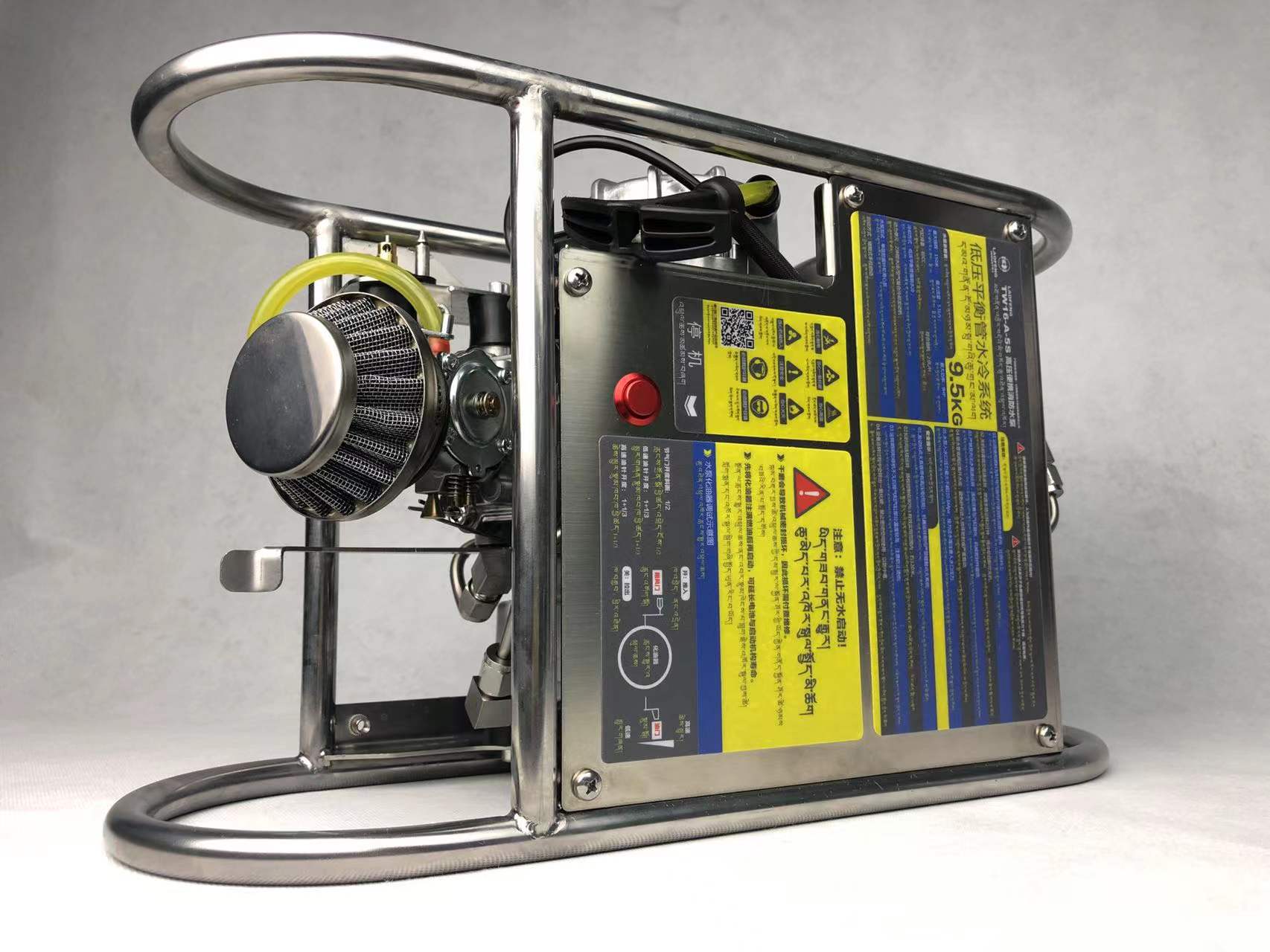 卧式单极便携高压消防水泵,采用低压平衡管循环水冷发动机,体积420x250x165mm,整机重量9.5kg,最大压力值可达1.6MPa,最大扬程160m,最大流量5.1升/秒,储能式手拉启动,使用全方位不锈钢加强外保护框架,有效保护内置的引擎和重要部件。